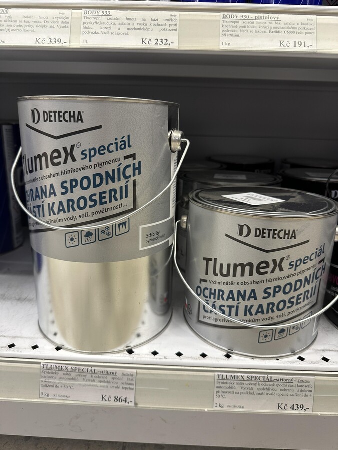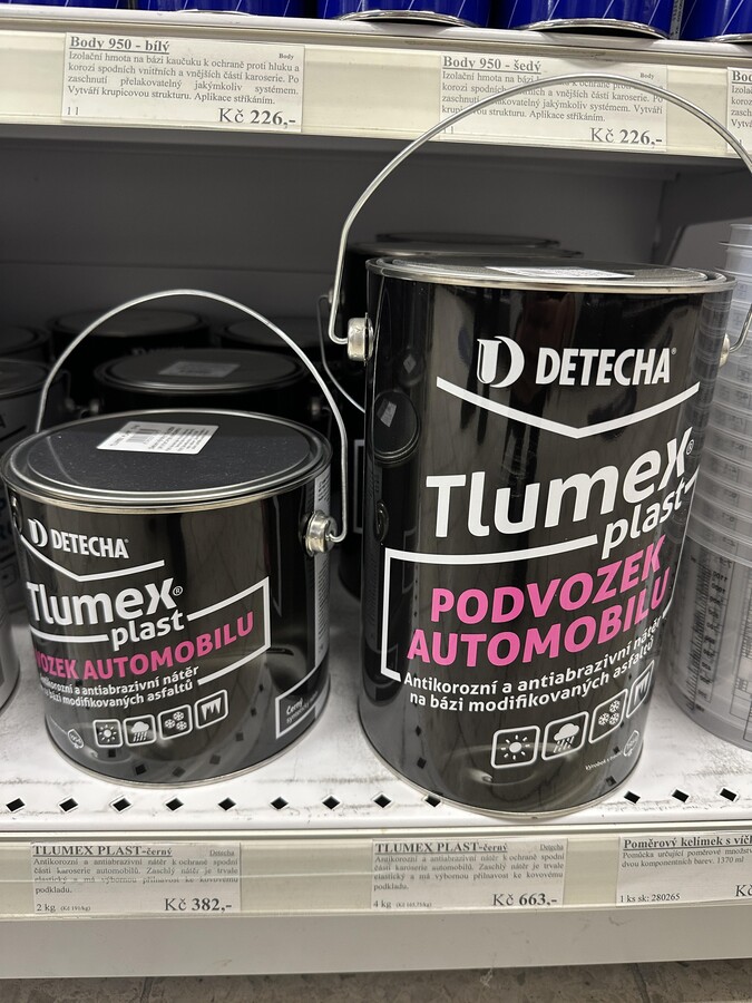 - TLUMEX plast – spolehlivý antikorozní a antitabrazivní nátěr, který chrání podvozek vašeho vozu před vlhkostí, solí i mechanickým poškozením.